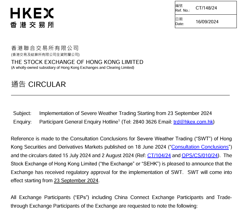 9月16日,港交所宣布,交易所已获监管机构批准实施恶劣天气交易。恶劣天气交易将由2024年9月23日起生效。在交易所或透过交易所(包括沪深港通的北向及南向交易)进行的证券交易将在恶劣天气情况下继续维持交易。与常规交易日的情况相若,所有交易所参与者需要于恶劣天气下继续提供交易相关的服务。